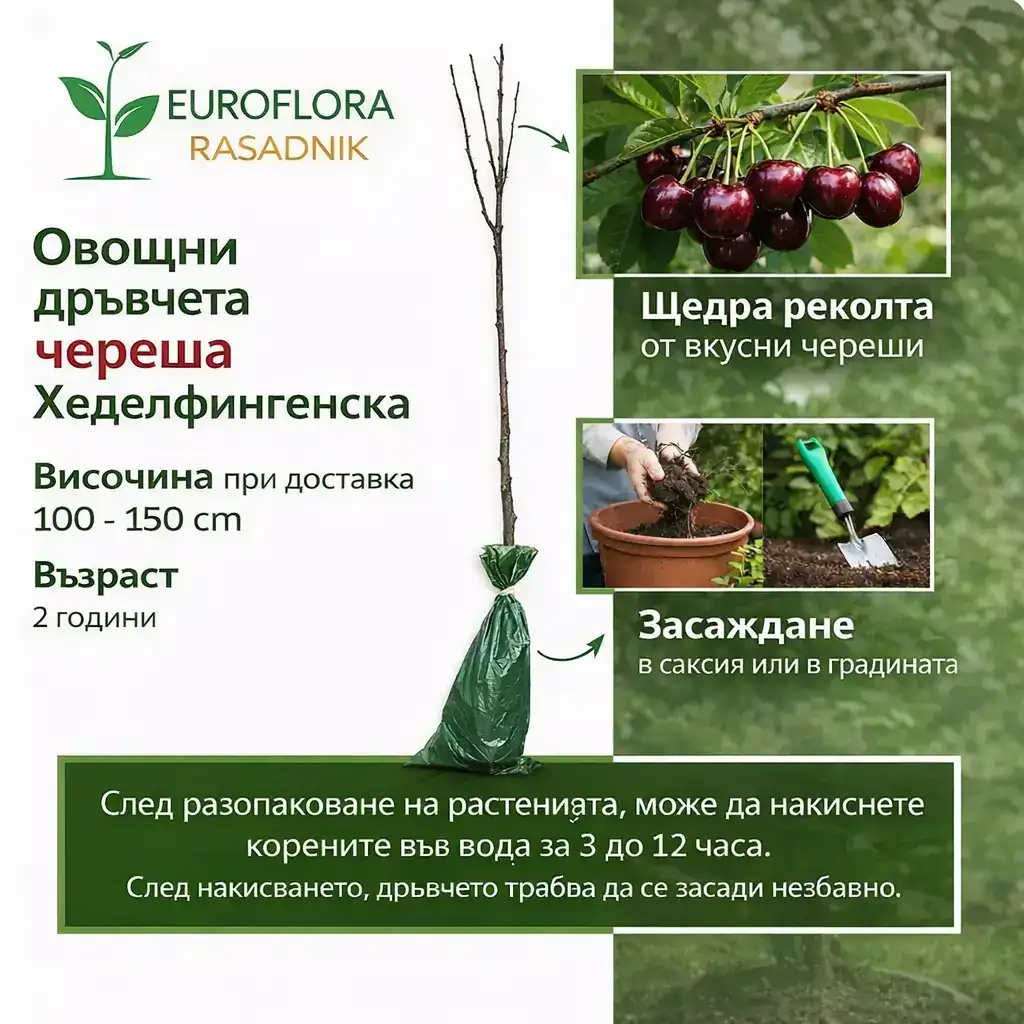 Фиданките череша Хеделфингенска от разсадник Еурофлора се отглеждат при контролирани условия и се предлагат добре вкоренени, здрави и подготвени за директно засаждане. Изборът на качествени овощни дръвчета череша Хеделфингенска е гаранция за дългогодишно плододаване, стабилна реколта и отлични вкусови качества.